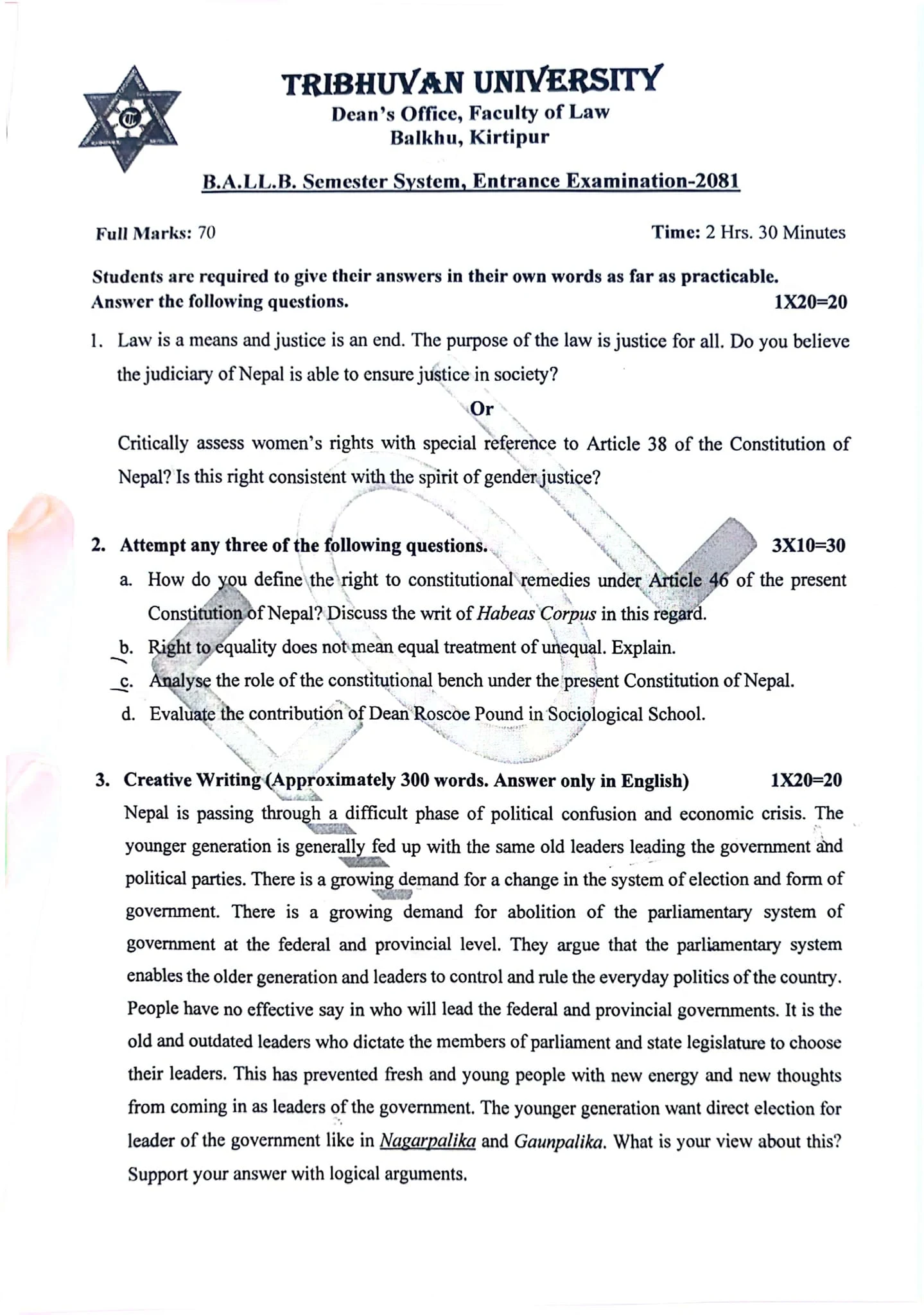 B.A.LL.B. Semester System, Entrance Examination-2081